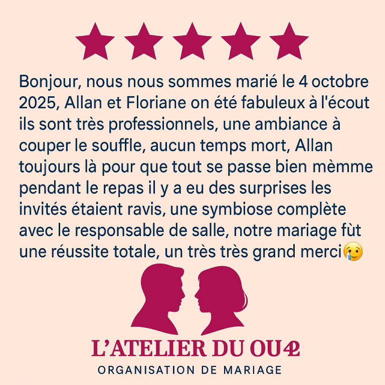 Prix selon le nombre de prestataires, le lieu et les détails spécifiques de votre mariage. Chaque projet est personnalisé pour répondre à vos besoins.